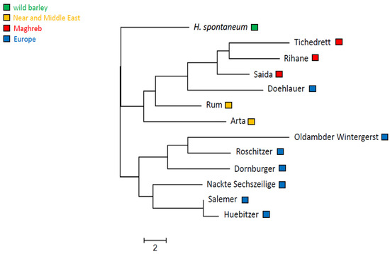 In fact, we found a phylogenetic pattern that reflected the geographic distribution of these landraces quite well (Figure 3). As to be expected, the wild H. spontaneum was an outgroup to the remaining accessions. The three Maghrebi genotypes formed one clade, the two Near East landraces Rum and Arta were basal to this clade and the majority of the European genotypes were forming a well separated clade with two subclades. These two clades had a partial, but not complete geographic differentiation. The French Salemer, the Middle German Hübitzer and the Southwest German Nackte Sechszeilige comprised one clade, while Roschitzer from Northeast Germany, and Dornburger from Saxonia fell into a second clade, which, however, also contained the Dutch Oldambter. The only genotype that fell out of the pattern, was the landrace Doehlauer from East Prussia (nowadays Poland). This landrace was located between the Maghrebi and the Near East genotypes.