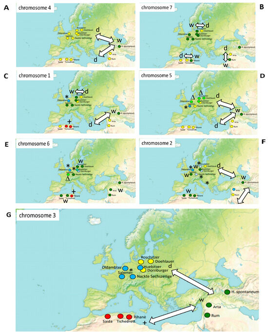 Biogeography of chromosomal diversity as assessed by SSR markers of the respective chromosome, using markers HvB23D on chromosome 4 (A), MBG318 on chromosome 7 (B), MGB402 on chromosome 1 (C), GMS61 on chromosome 5 (D), MGB371 and Ebmac624 on chromosome 6 (E), MGB391 and Ebmac0715 on chromosome 2 (F), Bmag19 and Hv13GIII on chromosome 3 (G). w indicates the wild allele found in H. spontaneum, d domesticated allele deriving thereof, +, *, Δ indicate alleles secondarily deriving from this domesticated allele.