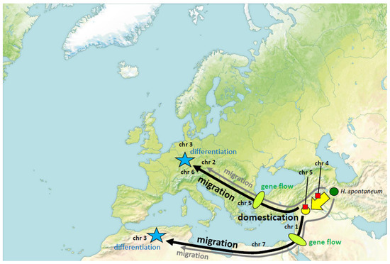 Processual model on phylogenetic relationships between barley landraces from the Middle East, Maghreb, and Central Europe based on asymmetric relations between individual chromosomes. Inferred temporal sequence of major geographic differentiation in individual chromosomes is indicated by the abbreviation. Red squares indicate differentiation linked to domestication, green ellipses indicate gene flow between domesticated barley and contaminating H. spontaneum, blue stars represent geographical differentiations occurring late, upon arrival in the target region.