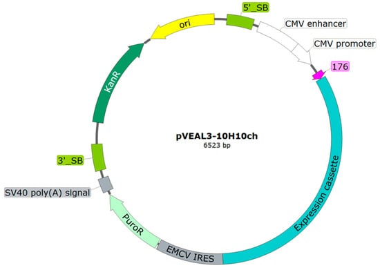 Schematic diagram of the integration plasmid vector pVEAL3-10H10ch. 5′_SB and 3′_SB—transposase SB100X binding sites; CMV promoter—CMV promoter region; 176—nucleotide sequence encoding a hybrid signal peptide from luciferase (Cypridina noctiluca) and fibroin (Dendrolimus spectabilis), facilitating protein export from the cell; EMCV IRES—internal ribosome entry site; PuroR—nucleotide sequence encoding resistance to the antibiotic puromycin; SV40 poly (A) signal—nucleotide sequence stabilizing mRNA transcripts through polyadenylation; KanR—nucleotide sequence encoding resistance to the antibiotic kanamycin; ori—origin of replication. The complete nucleotide sequence of the developed vector is presented in Figure S1.