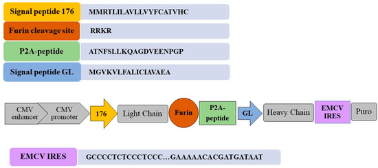 The objective of this study was to develop an integrative vector to facilitate the production of recombinant monoclonal antibodies in mammalian cells. To achieve this, specific elements, including signal peptides 176 and GL, an internal ribosome entry site (IRES), and the P2A peptide, were employed.