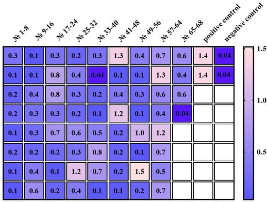 Among the 68 monoclonal clones analyzed, only two clones (No. 34 and No. 68) (2.9%) exhibited productivity comparable to the negative control. The OD values of the culture supernatants from the remaining monoclonal clones exceeded the negative control by at least three-fold. Based on these results, seven clones (10%) demonstrated high antibody production with OD values ≥ 1, equivalent to the positive control.