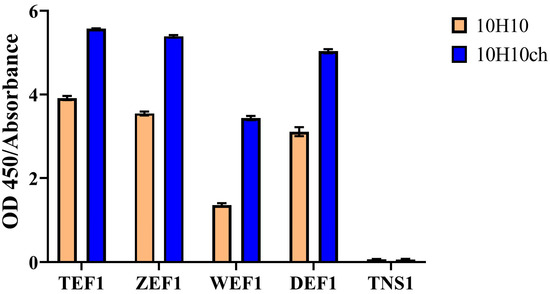 The results of the interaction of the recombinant 10H10ch and murine 10H10 antibodies with recombinant fragments of flavivirus envelope proteins are as follows: TEF1 represents the 1 + 2 domains of the E protein from tick-borne encephalitis virus; ZEF1 denotes the 1 + 2 domains of the E protein from Zika virus; WEF1 refers to the 1 + 2 domains of the E protein from West Nile virus; DEF1 comprises the 1 + 2 domains of the E protein from Dengue virus; and TNS1 indicates the non-structural protein 1 from tick-borne encephalitis virus.