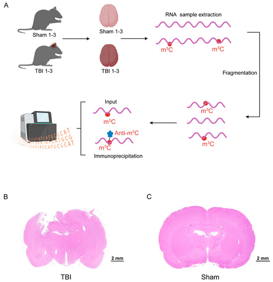Given the absence of relevant studies, it remains unclear whether the m5C methylation profile of long non-coding RNAs (lncRNAs) is altered following traumatic brain injury (TBI). To address this uncertainty, we conducted a comprehensive transcriptome analysis of m5C methylation in lncRNAs using MeRIP-Seq in the rat model of TBI. A flowchart summarizing the experimental procedure is shown in (Figure 1A). Twenty-four hours after establishing the TBI rat model, the rats were euthanized, and the intact brain tissues were collected under aseptic conditions for use in subsequent experiments. Notably, significant brain parenchymal damage was observed in the rats following TBI model construction (Figure 1B), whereas the brain parenchyma in the sham-operated group remained intact (Figure 1C).