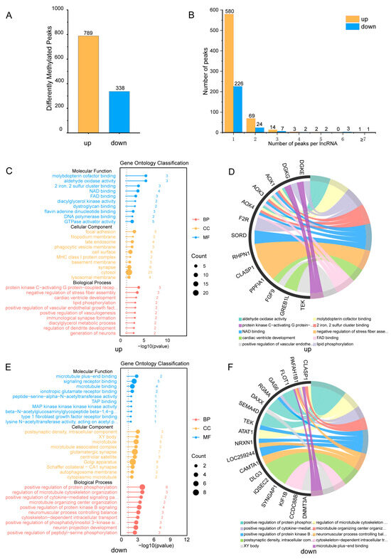 We further analyzed the differential m5C peaks to investigate alterations in m5C methylation after TBI. A total of 1127 m5C methylation significantly altered peaks were identified in the TBI group compared to the sham rats, including 789 up-regulated and 338 down-regulated m5C peaks (p < 0.05, FC > 2) (Figure 3A). Further analysis of these methylation peaks revealed that m5C methylation peaks and lncRNAs are not always in a one-to-one relationship; multiple methylation peaks can occur on the same lncRNA. However, in most cases, there is only one m5C methylation peak on a single lncRNA. Of the 789 up-regulated methylation peaks, 580 were located on individual lncRNAs, indicating that 580 lncRNAs had only one m5C peak. In addition, 69 lncRNAs had two methylation peaks, with a maximum of nine peaks found on a single lncRNA. For the down-regulated peaks, 226 lncRNAs had only one m5C peak, while 24 lncRNAs had two methylation peaks, with up to 15 m5C methylation peaks occurring on a single lncRNA (Figure 3B). To elucidate the functionality of these distinctively methylated genes, a GO analysis (http://www.geneontology.org (accessed on 8 November 2024)) was performed [35,36], which was on the basis of differentially methylated genes that were analyzed to determine their associated biological processes (BPs), cellular components (CCs), and molecular functions (MFs). A p-value less than 0.05 was considered the significant GO terms. For lncRNAs with hyper-methylated peaks, we identified a total of 869 GO terms (Supplementary S2) and presented the top ten terms for each category (Figure 3C). For the BP, they were enriched at the protein kinase C-activating (PKC) G protein-coupled receptor (GPCR) signaling pathway, the negative regulation of stress fiber assembly, the positive regulation of the vascular endothelial growth factor receptor (VEGFR) signaling pathway, and neuron generation, which are related to the regulation of TBI mechanisms. For the MF, genes with up-methylated m5C peaks were notably enriched in activities such as the GTPase activator activity, the aldehyde oxidase activity, molybdopterin cofactor binding, and 2 iron, 2 sulfur cluster binding. For the CC, genes with up-methylated m5C peaks were mainly enriched in the focal adhesion, filopodium membrane, late endosome, phagocytic vesicle membrane, etc. For lncRNAs with hyper-methylated peaks, we identified a total of 789 GO terms (Supplementary S3) and presented the top ten terms for each category (Figure 3E). The BP was enriched in the positive regulation of protein phosphorylation, the positive regulation of the cytokine-mediated (JAK-STAT) signaling pathway, the positive regulation of phosphatidylinositol 3-kinase (PI3K) signaling pathway, and so on. The CC was enriched in the postsynaptic density, intracellular component, XY body and microtubule, etc. The MF was enriched in the microtubule plus-end binding, the signaling receptor binding, the microtubule binding, etc. Subsequently, we demonstrate the interrelationship between distinct GO categories and genes (Figure 3D,F). Then, we listed the top 10 lncRNAs with the greatest differences in up-regulated and down-regulated methylation enrichment levels (Table 1).
