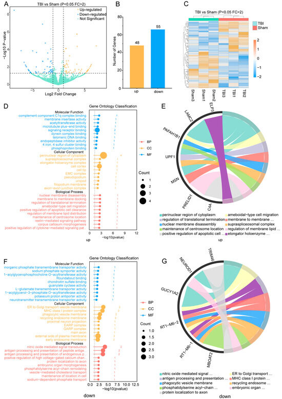 Following TBI, substantial changes were observed not only in the methylation but also in the expression profiles of lncRNAs. Our sequencing results confirmed these findings, identifying a total of 1487 up-regulated and 1600 down-regulated lncRNAs (Figure 4A). Among these, 103 genes showed significant differential expression, with 48 up-regulated and 55 down-regulated genes (Fold change > 2, p < 0.05) (Figure 4B). The heatmap displays the relative expression levels of each sample in the TBI and sham groups, where samples within the same group exhibited similar patterns, while distinct patterns were observed between the two groups (Figure 4C). The GO enrichment analysis uncovered possible roles for lncRNAs that were expressed differently. For genes with hyper-methylation, the BPs were enriched in nuclear membrane disassembly, the positive regulation of the JAK-STAT signaling pathway, and the reelin-mediated (RM) signaling pathway. The CCs were enriched in the perinuclear region of the cytoplasm, the supraspliceosomal complex, and the elongator holoenzyme complex. The MFs were enriched in signaling receptor binding, acetyltransferase activity, and endopeptidase inhibitor activity (Figure 4D). We further demonstrated the interrelationships between distinct GO categories and genes (Figure 4E). Detailed GO terms are provided in the supplementary file (Supplementary S4). For genes with hypo-methylation, the BPs were enriched in nitric oxide-mediated signal transduction, phosphatidylserine acyl-chain remodeling, and neurotransmitter loading into synaptic vesicles. The CCs were enriched in proximal neuron projection, the axon initial segment, and presynaptic active zone. The MFs were enriched in guanylate cyclase activity, L-glutamate transmembrane transporter activity, and neurotransmitter transmembrane transporter activity (Figure 4F). We also demonstrated the interrelationships between different GO categories and genes (Figure 4G). Detailed GO terms are provided in the supplementary file (Supplementary S5). Subsequently, we listed the 20 lncRNAs with the most significantly different expression levels, showing the top up-regulated and down-regulated lncRNAs (Table 2).