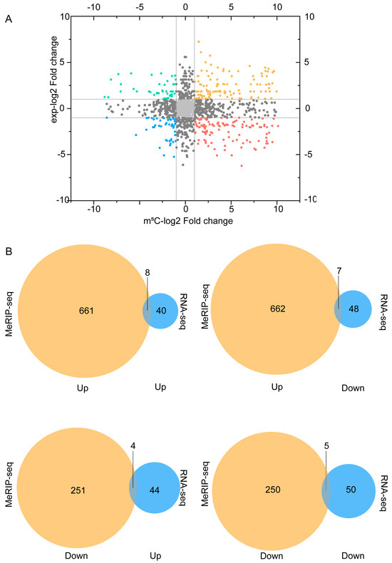 Combined analysis of m5C methylation and lncRNA expression after TBI: (A). The nine-quadrant plot illustrates the correlation between lncRNA m5C methylation and the corresponding lncRNA expression. Top-right quadrant: both methylation and gene expression are up-regulated (m5C-fold change > 2 and Exp-fold change > 2). Top-left quadrant: methylation is down-regulated while gene expression is up-regulated (m5C-fold change < −2 and Exp-fold change > 2). Bottom-left quadrant: both methylation and gene expression are down-regulated (m5C-fold change < −2 and Exp-fold change < −2). Bottom-right quadrant: methylation is down-regulated while gene expression is up-regulated (m5C-fold change > 2 and Exp-fold change < −2). (B). Venn diagrams showing the overlap between the number of differentially methylated genes and the number of differentially expressed lncRNAs.
