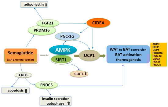 The pivotal signaling pathway by which semaglutide through GLP-1/GLP-1R can enhance BAT thermogenesis-WAT browning is the master cellular energy regulation protein of the body, AMPK [77,78,79]. AMPK, through the activation of SΙRΤ1, another important mitochondrial activator, promotes the differentiation process into brown and beige, increasing the expression levels of UCP1 [49]. SIRT1 is found to be activated by semaglutide as determined by an experiment in mice [80] (Figure 1).