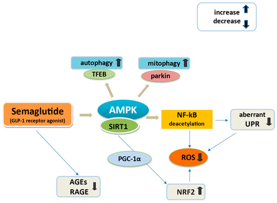 Recently, in the study of Martins et al. semaglutide enhanced UCP1 and lessened ER stress genes, presenting a significant anti-inflammatory beneficial effect beyond weight loss, in obese mice [95]. In addition, because GLP-1 inhibits the AGEs-induced RAGE gene expression and ROS generation in T2D [158], it may be hypothesized that semaglutide could reduce ROS production through AGE-RAGE mediation [159].