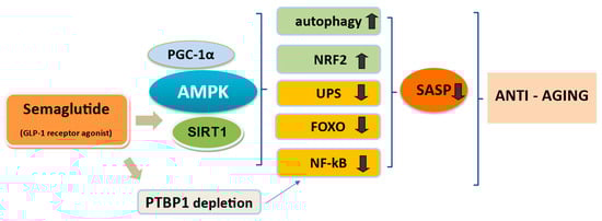 Semaglutide can activate several signaling pathways compromised during ageing, mainly AMPK and SIRT1, which play an important role between autophagy and senescence, engaged in the pathobiology of ageing and age-linked disorders (Figure 3) [190]. NF-kB and C/EBPα complexes, both associated with inflammatory responses, are currently recognized as the main transcription factors globally regulating SASP expression [191]. Semaglutide, i.e., through AMPK/SIRT1/PGC-1α, may blockade NF-kB and FOXO transcription factors, revealed as critical mediators in inflammation of crucial cellular components in mammals during ageing [177,187,192,193]. In addition, PTBP1 depletion by semaglutide downmodulates the NF-kB pathway and mechanistically can be envisioned to counteract the inflammatory effects of SASP [191]. Semaglutide may also upregulate transcriptional responses to oxidative stress, which decrease with ageing, owing to the declining function of the stress-responsive NRF2 [194]. UPS dysregulation occurs in the ageing process and several ageing-related diseases in mammals, and this proteostasis system failure accelerates the accumulation of misfolded proteins and aggregation of damaged organelles [195]. Semaglutide interferes with the UPS and autophagy-lysosomal system, two crucial mechanisms that mediate the renewal of cellular organelles and removal of large aggregates like SASP [182,195]. Many age-related pathologies and the ageing process itself are accompanied by dysregulation of UPS, autophagy and crosstalk between both systems [139].