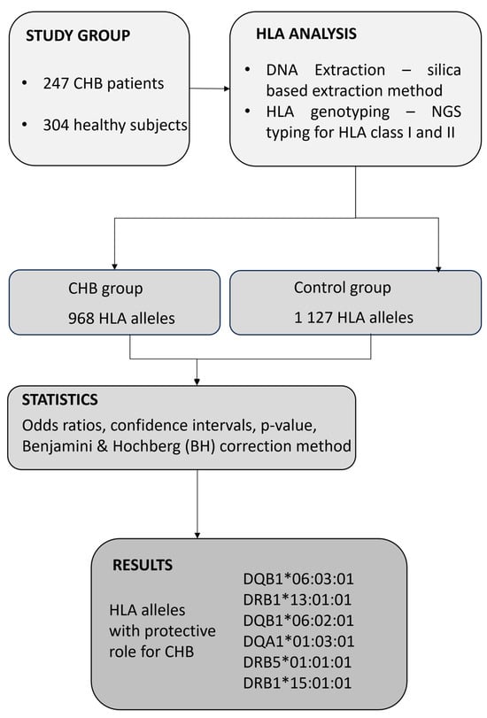 The present study was conducted in accordance with the Declaration of Helsinki (2013 version) and was approved by the Commission of Bioethics at the Fundeni Clinical Institute, Romania (No. 28640/25.05.2022). For collecting biological samples as well as for all medical procedures performed during the study, all participants signed an informed consent statement. In this study, we consecutively selected 247 patients with chronic HBV infection, defined as the presence of HBsAg and HBV DNA for more than six months, as identified at Fundeni Clinical Institute, Department of Gastroenterology and Hepatology, between September 2022 and October 2023. The study also included 304 healthy control subjects who were bone marrow volunteer donors. None of the donors reported a personal history of cancer or any HLA-associated disease, including chronic infections or autoimmune diseases. All of the study subjects were Caucasian, a single ethnic population. Patients were included in this study if their age was over 18 years. The diagnosis of chronic HBV infection was based on well-established biochemical and virological parameters. Thus, each patient was routinely analyzed for biochemical markers such as alanine aminotransferase (ALT), gamma glutamyl transpeptidase (GGT), aspartate aminotransferase (AST), alkaline phosphatase (ALP), total bilirubin (TB), and direct bilirubin (DB) using well-established enzymatic methods. Virological markers, HBs antigen (HBsAg), anti-HBs antibodies, HBe antigen (HBeAg), anti-HBe antibodies, anti-HBc antibodies (including total anti-HBc antibodies and anti-HBc IgM), and α-fetoprotein (AFP) were quantified through chemiluminescence. The following exclusion criteria were employed in the study: patients younger than 18 years, positive for co-infection with human immunodeficiency virus (HIV), hepatitis C virus (HCV), hepatitis D virus (HDV), hepatitis A virus (HAV), autoimmune hepatitis (AIH), and other liver diseases. All participants were Caucasian in the current study. A flow chart explaining the study design is presented in Figure 1.