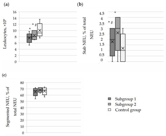 Comparative analysis of the total number of polysegmentonuclear leukocytes and the content of morphological forms of neutrophils in the blood of pregnant women in the subgroups of the main group and in the control group. (a) Assessment of the distribution of the total number of leukocytes based on clinical blood analysis in the pregnant women of the study groups. (b) Analysis of the percentage content of band neutrophils out of the total number of neutrophils in the blood of the pregnant women of the study groups. (c) Analysis of the percentage content of segmented neutrophils out of the total number of neutrophils in the blood of the pregnant women of the study groups. The results are presented as median, lower and upper quartiles with the overall range of value changes. Comparison of data in the groups was conducted using the Kruskal–Wallis test, * p < 0.05 compared to the control group, # p < 0.05 significance of differences between subgroup 1 and subgroup 2 in the main group.