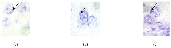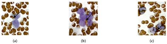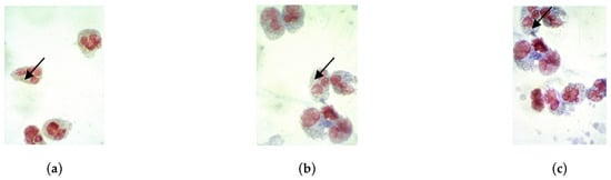 Assessment of the intensity of the cytochemical reaction to cationic proteins in neutrophil granulocytes. Distribution of reaction products in the cytoplasm (in the form of blue-brown granules) are indicated by arrows. Magnification 100×, immersion, light microscopy. Intensity of staining of reaction products for cationic proteins: (a) Subgroup 2; (b) Subgroup 1; (c) Control group.