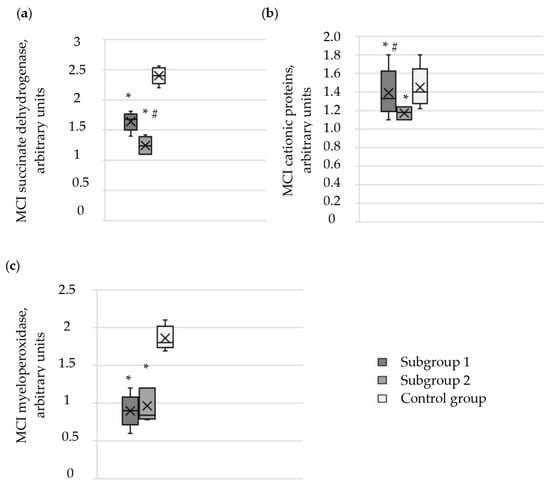 Assessment of the functional activity of neutrophil granulocytes based on the average cytochemical coefficient of succinate dehydrogenase, cationic proteins, and myeloperoxidase in the subgroups of pregnant women in the main group and in the control group. (a) Comparative analysis of succinate dehydrogenase indicators in neutrophils of blood in the pregnant study groups. (b) Assessment of the amount of cationic proteins in neutrophils of blood in the pregnant study groups. (c) Comparative analysis of myeloperoxidase indicators in neutrophils of blood in the pregnant study groups. The results are presented as median, lower and upper quartiles with the overall range of value changes. Comparing the data groups was conducted using the Kruskal–Wallis test, * p < 0.05 compared to the control group, # p < 0.05 significance of differences between subgroup 1 and subgroup 2 in the main group.
