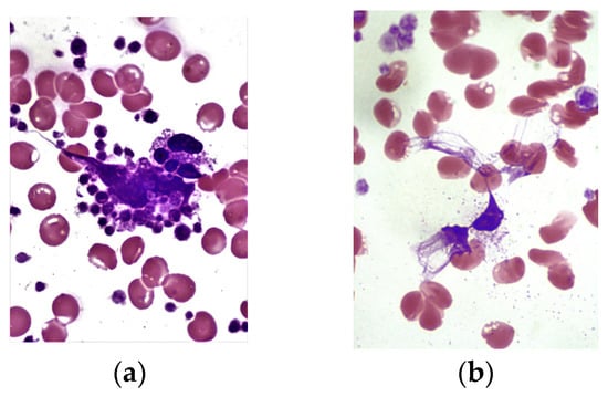 Evaluation of the content of neutrophil extracellular traps (NETs) in the blood of pregnant women in the main group using the Romanowsky-Giemsa method. Magnification 100×, immersion, light microscopy. (a) Presence of platelet-neutrophil complexes and NETs in pregnant women in subgroup 2; (b) Decondensed DNA of neutrophils in complex with granulated proteins in the extracellular space in pregnant women in subgroup 1.