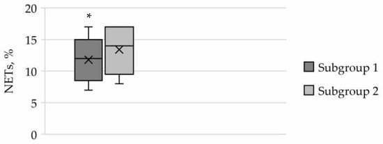 Evaluation of the number of neutrophil extracellular traps (NETs) as a proportion of the total number of leukocytes in the blood of pregnant women in the subgroups of the main group. The results are presented as median, lower and upper quartiles with the overall range of value changes. The comparison of data in the subgroups was conducted using the Mann–Whitney U test, * p < 0.05.