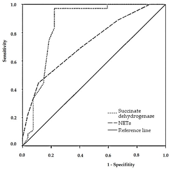 The diagnostic efficiency of each, calculated based on their sensitivity and specificity, respectively, was 69.7% for NETs and 81% for succinate dehydrogenase. Each of these parameters was characterized by favorable prognostic ability, as evidenced by the values of the area under the curve (AUC). The optimal threshold probability value for succinate dehydrogenase was equal to or less than 1.43, and for NETs—equal to or greater than 11.5%.