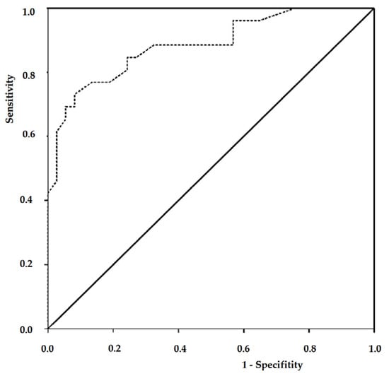 The logistic regression method indicated that succinate dehydrogenase (OR = 0.75, 95% CI: 0.6–0.9, p = 0.002) and NETs (OR = 0.76, 95% CI: 0.64–0.91, p = 0.003) could be utilized as independent predictors of pneumonia severity in pregnant women in the main group. Other independent variables, both clinical (age, BMI, gestational age, lung damage characteristics from computer tomography) and laboratory (myeloperoxidase, cationic proteins), did not exert a significant influence on the severity of lung damage in pregnant women (p > 0.05).