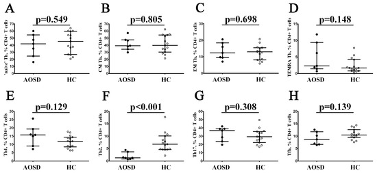 Alterations in Th cell maturation and ‘polarization’ in patients with AOSD. Scatter plots (A–D) show the frequencies of ‘naïve’, central memory (CM), effector memory (EM), and terminally differentiated CD45RA-positive effector memory (TEMRA) CD4+ T cells within total CD4+ T cells, respectively. Scatter plots (E–H) show Th1, Th2, Th17, and follicular Th frequencies within total CD4+ T cells, respectively. Black circles—patients with AOSD (AOSD, n = 7); white circles—healthy control (HC, n = 15). Each dot on scatter plots represents individual subjects, and horizontal bars show the group medians and quartile ranges (Med (Q25; Q75)). The p-value was determined by the Mann–Whitney U-test.