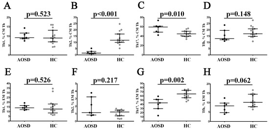 Alterations in relative numbers of Th2 and Th17 cell subsets in patients with AOSD. Scatter plots (A–H) show the frequencies of Th1, Th2, Th17, and follicular Th within total CM and EM CD4+ T cells, respectively. Black circles denote patients with AOSD (AOSD, n = 7); white circles—healthy control (HC, n = 15). Each dot on scatter plots represents individual subjects, and horizontal bars show the group medians and quartile ranges (Med (Q25; Q75)). The p-value was determined by the Mann–Whitney U-test.