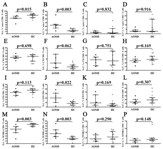 Imbalance in peripheral blood Tc1, Tc2, Tc17, and Tc17.1 cells in major CD8+ T-cell subsets with varying patterns of CD45RA and CD62L expression in patients with AOSD. Scatter plots (A–P) show the relative numbers of Tc1, Tc2, Tc17 andTc17.1 cells within ‘naïve’, central memory, effector memory, and TEMRA CD8+ T cells, respectively. Black circles denote patients with AOSD (AOSD, n = 7); white circles—healthy control (HC, n = 15). Each dot represents individual subjects, and horizontal bars depict the group medians and quartile ranges (Med (Q25; Q75)). The p-value was determined by the Mann–Whitney U-test.
