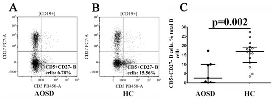 Finally, we determined CD5 vs. CD27 co-expression and distinguished CD5+CD27– cells with regulatory properties within the total B-cell population. We found that the frequency of CD5+CD27– B cells was dramatically decreased in patients with AOSD vs. healthy controls (2.53% (0.24; 9.98) vs. 16.80% (10.92; 19.21) with p = 0.002, Figure 5).