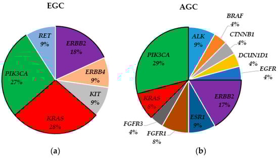 Pie charts showing the frequencies of the gene mutations. (a) Frequencies of the different gene mutations in early gastric cancer (EGC). (b) Frequencies of the different gene mutations in advanced gastric cancer (AGC). The three most frequently mutated genes, PIK3CA (filled with green), ERBB2 (filled with violet), and KRAS (filled with red), are highlighted with a black border.