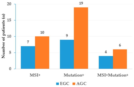 MSI constitutes approximately 15–30% of GCs, with the majority falling under the category of intestinal-type, which has been linked to certain demographic and clinical characteristics. Patients with MSI GCs are often older (≥65 years), more frequently female, and exhibit tumors located in the middle/lower gastric body []. Furthermore, they tend to have less frequent lymph node involvement and a lower inclination to invade serosal layers. MSI GC patients are commonly diagnosed at earlier disease stages (TNM stage I or II) and classified as Borrmann type I or II []. Histologically, these tumors typically feature highly pleomorphic cells organized in distinctive growth patterns, association with mucinous GC or mucin 6 positivity, and prominent infiltration of lymphoid cells []. However, the MSI subgroup appears to be diverse, suggesting that other genetic factors might be influential for these specific patients [,]. In EGC, which involves tumors confined to the mucosa or submucosa without spreading beyond the stomach wall, the somatic mutation landscape may differ from that of AGC, where the cancer has progressed to deeper layers of the stomach wall or metastasized to other organs. In EGC, which refers to tumors that are confined to the mucosa or submucosa and have not spread beyond the stomach wall, there may be variations in MSI status compared to AGC, where the cancer has progressed to deeper layers of the stomach wall or beyond []. Studies suggest that MSI-high (MSI-H) tumors, characterized by a high level of microsatellite instability, may be more prevalent in certain subtypes of GC. These tumors exhibit a higher mutation rate due to impaired DNA repair mechanisms, and this can have implications for prognosis and treatment response. On the other hand, MSI-low (MSI-L) or microsatellite stable (MSS) tumors are associated with a lower frequency of replication errors. Understanding the MSI status in both early and advanced stages of GC is crucial for tailoring treatment strategies, predicting patient outcomes, and advancing our knowledge of the genetic mechanisms underlying gastric carcinogenesis. Further research is needed to explore the nuances of MSI status in different stages of GC and its clinical implications [].