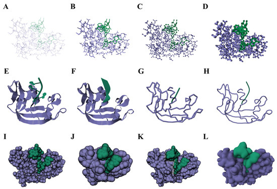 The lines model (Figure 2A) is a representation method using lines to connect atoms and emphasizes the basic features and geometric relationships within the structure. The stick model (Figure 2B) is similar to the lines model, but it uses sticks to connect atoms. Ball-and-stick models (Figure 2C) and space-filling models (Figure 2I) use spheres to represent atoms, with each sphere’s radius typically being proportional to the corresponding atomic radius. This facilitates an understanding of the relative positions and structural relationships of atoms in the molecule. Space-filling models can also represent the spatial occupancy of atoms through the size and position of the spheres, revealing gaps and channels in the molecular structure. In addition to these common representation models, Chavent et al. [27] introduced a new method called HyperBall (Figure 2D), which uses hyperboloids to connect atoms represented in the form of spheres. HyperBall achieves a higher rendering efficiency and quality than triangle meshes inspired by GPU ray casting techniques.