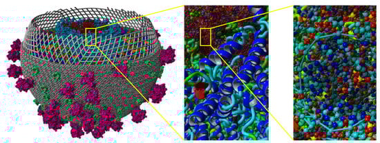 YASARA View (http://www.yasara.org/ (accessed on 15 October 2023)) [16] is used to visualize HIV at a mesoscopic level. The LOD technique is used with the appropriate level of detail. The color scheme is adjusted adaptively.