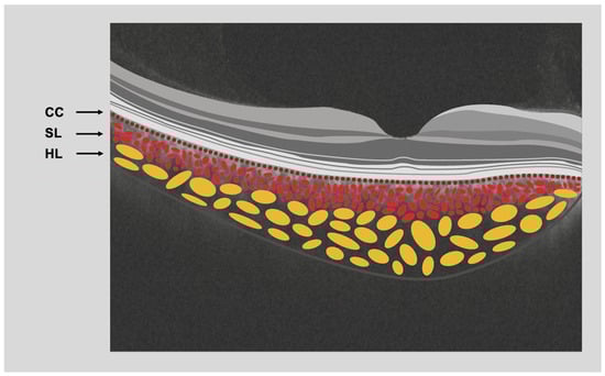 | SS-OCT | Physiological foveal and subfoveal choroid, with marked thinning of the retina with complete disorganization of retinal layers in the atrophic chorioretinal area. In the atrophic regions, there is typically a notable decrease in the thickness of the choroid, characterized by the absence of Sattler’s layer and diminished choroidal vascularity [1,2,6]. |