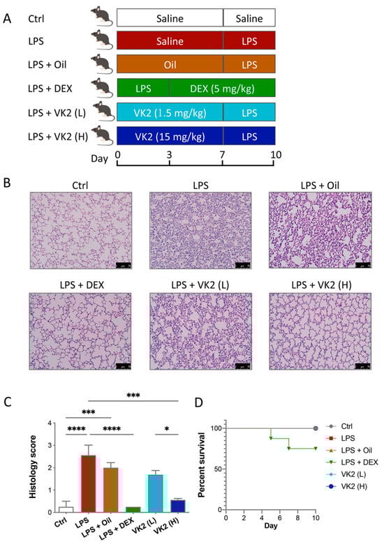 VK2 alleviated LPS-induced acute lung injury in mice. (A) Mice were pre-administered a solvent or vitamin K2 (1.5 and 15 mg/kg, respectively), followed by intraperitoneal injection of lipopolysaccharide (7 mg/kg). (B) Hematoxylin–eosin staining (original multiple: 200×, scale = 75 μm) was performed on paraffin sections of lung tissue for histological scoring. (C) Lung tissue injury in each group was evaluated by histological score. (D) The survival curves of ALI mice treated with DEX and VK2. Values represent means ± SEM; * p < 0.05, *** p < 0.001, and **** p < 0.0001.