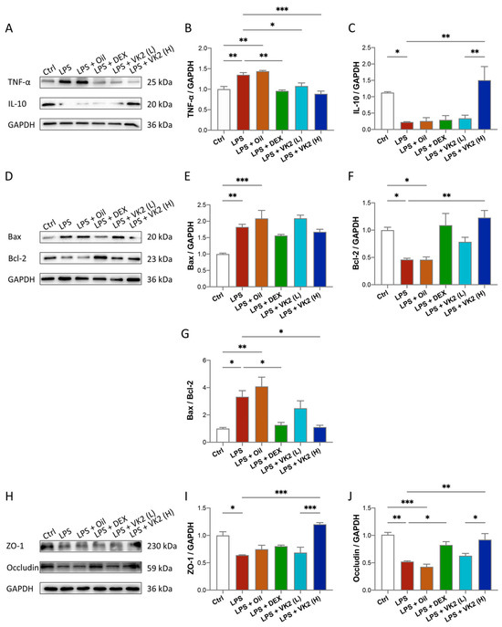 VK2 alleviates inflammation, apoptosis, and TJ injury in LPS-induced acute lung injury. (A) The protein expression levels of TNF-α and IL-10 were detected by immunoblotting. (B,C) Quantitative analysis of TNF-α and IL-10 was performed using Image J software (1.8.0) with glyceraldehyde-3-phosphate dehydrogenase (GAPDH) as an internal reference. (D) The protein expression levels of BAX and Bcl-2 were detected by immunoblotting. (E–G) Quantitative analysis of BAX, Bcl-2, and the ratio of BAX/Bcl-2 was performed using Image J software with glyceraldehyde-3-phosphate dehydrogenase (GAPDH) as an internal reference. (H) The protein expression levels of ZO-1 and occludin were detected by immunoblotting. (I,J) Quantitative analysis of ZO-1 and occludin was performed using Image J software with glyceraldehyde-3-phosphate dehydrogenase (GAPDH) as an internal reference. The value represents the mean ± standard error; * p < 0.05, ** p < 0.01, and *** p < 0.001.