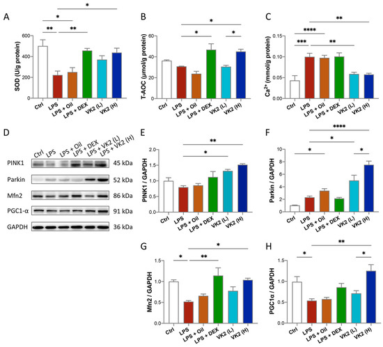 LPS challenge increases pulmonary oxidative stress that is confirmed by lower levels of some antioxidants [34]. Therefore, we investigated the effect of VK2 on the lung levels of some oxidative-stress-related indicators in the ALI model. Our results showed significantly lower levels of SOD activity (p = 0.0024, Figure 3A) in the LPS group when compared with comparable findings of the control group. On the contrary, VK2 pretreatment in the LPS group at 15 mg/kg, but not at 1.5 mg/kg, significantly and suitably improved level of SOD (p = 0.0209, Figure 3A) and T-AOC (p = 0.0246, Figure 3B). Calcium is an important second messenger and it is widely recognized that intracellular calcium (Ca2+) oscillations are vital in ALI, leading to reduced integrity of the lung epithelial and endothelial barriers and increased lung inflammation [35]. As is presented in Figure 3C, LPS evoked a significant Ca2+ increase compared with the control group (p = 0.0003), while VK2 pretreatment significantly decreased Ca2+ levels (p = 0.0035). Mitochondria are involved in immunological responses, redox signaling, apoptosis, autophagy, and maintaining calcium homeostasis [36]. Western blot analysis results showed that compared with the control group, the expression levels of Mfn2 (Figure 3D,G) and PGC1-α (Figure 3D,H) in the LPS group were significantly decreased by approximately 0.5-fold (p = 0.0264 and 0.0492). Compared with LPS group, VK2 administration significantly increased the expression of PINK1 (Figure 3D,E), Parkin (Figure 3D,F), Mfn2 (Figure 3D,G), and PGC1-α (Figure 3D,H) to approximately 1.9-fold (p = 0.0013), 3.2-fold (p < 0.0001), 2-fold (p = 0.0158), and 2.5-fold (p = 0.0019), respectively. These results indicated that VK2 could inhibit oxidative stress and calcium overload by improving mitochondrial impairment.
