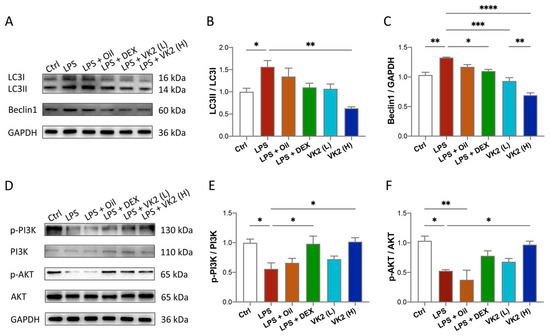 VK2 alleviates LPS-induced lung autophagy through PI3K/AKT pathway. (A) The protein expression levels of LC3 and Beclin1 were detected by immunoblotting. (B,C) Quantitative analysis of the ratio of LC3II/LC3I and Beclin1 were performed using Image J software with glyceraldehyde-3-phosphate dehydrogenase (GAPDH) as an internal reference. (D) The protein expression levels of p-PI3K, PI3K, p-AKT, and AKT were detected by immunoblotting. (E,F) Quantitative analysis of the ratio of p-PI3K/PI3K and p-AKT/AKT were performed using Image J software with glyceraldehyde-3-phosphate dehydrogenase (GAPDH) as an internal reference. The value represents the mean ± standard error; * p < 0.05, ** p < 0.01, *** p < 0.001 and **** p < 0.0001.