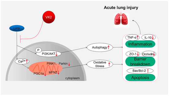 Overview of the effects and mechanisms of VK2 in LPS-induced ALI. On the one hand, VK2 leads to ensuring mitochondrial function, thereby inhibiting oxidative stress, and further inhibiting inflammation, apoptosis, and tight junction protein loss. On the other hand, VK2 inhibits excessive autophagy by upregulating the PI3K/AKT pathway, thereby reducing inflammation, apoptosis, and tight junction protein loss.