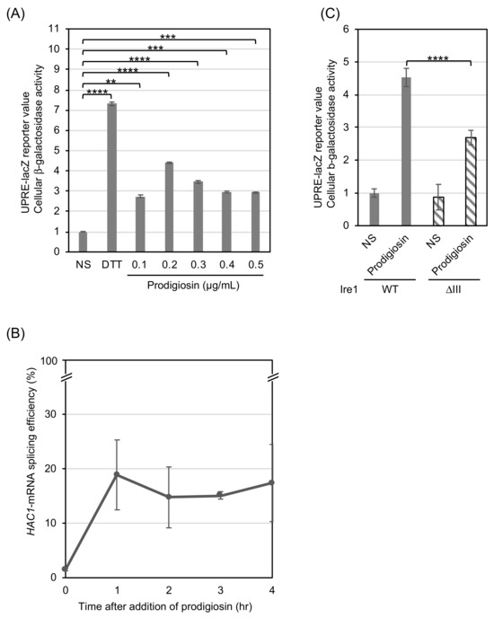 In the experiment shown in Figure 1A, we used S. cerevisiae IRE1+ cells carrying the UPRE-lacZ reporter plasmid, from which bacterial β-galactosidase was expressed under the control of UPRE. As expected, cellular β-galactosidase activity increased when DTT, which cleaves protein disulfide bonds and acts as a strong ER stressor, was added to the culture medium. Importantly, prodigiosin also induced the expression of the UPRE-lacZ reporter, suggesting ER stress evocation by prodigiosin. The UPRE-lacZ values seemed to be almost equally elevated by different concentrations of prodigiosin (from 0.1 to 1.0 mg/mL). Because the UPRE-lacZ value was highest, albeit not drastically, when prodigiosin was added into cultures at a concentration of 0.2 µg/mL, we employed this concentration of prodigiosin for the following experiments.