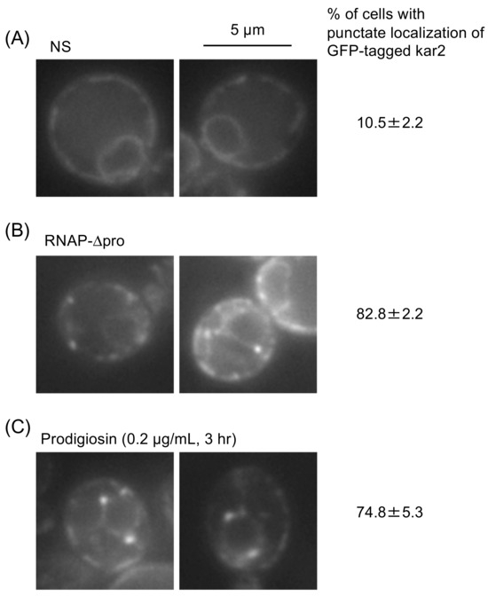 Binding immunoglobulin protein (BiP) is a prominent molecular chaperone located in the ER. S. cerevisiae BiP is called Kar2 and is known to bind to unfolded proteins accumulated in the ER [26]. Unfolded proteins are sometimes aggregated, recruiting Kar2, which then exhibits punctate distribution [25,29,30]. In the experiment shown in Figure 2, we used S. cerevisiae cells that express Kar2 carrying the GFP tag just before the C-terminal HDEL ER-retention signal [24]. As previously reported [24], GFP-tagged Kar2 exhibited a typical ER-like double-ring localization pattern, indicating its diffusive distribution through the ER (Figure 2A). In contrast, GFP-tagged Kar2 partly exhibited dot-like localization in cells expressing RNAP-∆pro, which is a heterologous aberrant protein that accumulates and aggregates in the ER of S. cerevisiae cells [25]. Notably, a similar localization pattern was observed when cells were treated with 0.2 µg/mL prodigiosin for 3 h (Figure 2C).