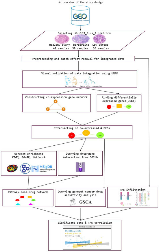 We downloaded nine gene-expression datasets from the Gene Expression Omnibus database (GEO http://www.ncbi.nlm.nih.gov/geo/ accessed on 15 December 2023) with the filters Study type = ‘Expression profiling by array’, Organisms = ‘Homo sapiens’, and Platform = ‘GPL570 ([HG-U133_Plus_2] Affymetrix Human Genome U133 Plus 2.0 Array)’. We selected datasets containing normal, borderline, and low serous samples (Table 1). Figure 1 provides a visual representation of the study design, offering an extensive overview of the key elements and methodologies used in the research.