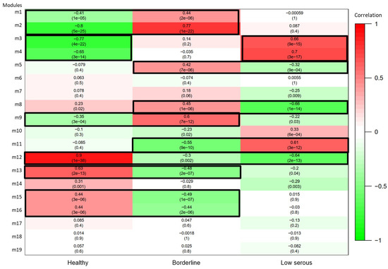 A module-trait heatmap is a visual representation of the correlations between the expression levels of genes in each module and different clinical and pathological traits. The heatmap is generated by calculating the Pearson correlation coefficient (PCC), also known as the eigengene significance, between the expression levels of genes in each module and each trait. The PCCs are then color coded, with red representing positive correlations and green representing negative correlations. The darker the color, the stronger the correlation. (Each box displays a correlation value above and a corresponding p-value in parentheses below.).