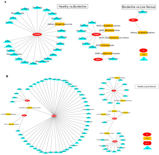 (A) Healthy vs. borderline and borderline vs. low serous groups pathway term gene–drug interaction results plot. (B) Healthy vs. low serous group pathway term gene and transcription factor gene–drug interaction results plot. (Abbreviations of figure legend, Up: upregulated gene, Up-TF: upregulated transcription factor gene, Inh: inhibitory drug).