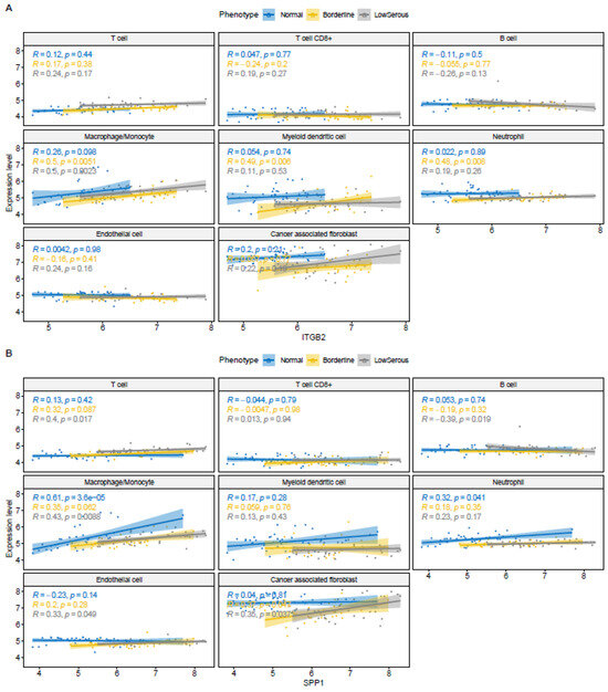We found a moderate correlation between ITGB2 expression and the macrophage–monocyte proportion in borderline and low serous tissue (r = 0.5, p = 0.0051, r = 0.5, p = 0.0023, respectively), as well as a moderate correlation with myeloid dendritic cell (r = 0.49, p = 0.006) and neutrophil (r = 0.48, p = 0.008) in borderline tissue (Figure 7A). A moderate correlation between CD74 expression and B cell in borderline tissue (r = 0.46, p = 0.012), a moderate correlation between macrophage–monocyte in borderline and low serous tissue (r = 0.5, p = 0.0051, r = 0.5, p = 0.0023, respectively) was found. We also found a moderate correlation between myeloid dendritic cell (r = 0.49, p = 0.006) and neutrophil (r = 0.48, p = 0.008) in borderline tissue. For IGF1, whose expression increases in the transition from borderline to low serous, we found a moderate correlation between its expression and T cell in low serous tissue (r = 0.5, p = 0.002), and a moderate correlation between cancer-associated fibroblast in borderline and low serous tissue (r = 0.5, p = 0.0059, r = 0.48, p = 0.0036, respectively). For SPP1 in the EMT pathway, whose expression increases in the transition from healthy to low serous, there is a moderate correlation between its expression and T cell in low serous tissue (r = 0.4, p = 0.017), a moderate negative correlation between B cell in low serous tissue (r = −0.39, p = 0.019), a moderate negative correlation between macrophage–monocyte in low serous tissue (r = 0.43, p = 0.0088) and a moderate correlation between cancer-associated fibroblast in borderline and low serous tissue (r = 0.37, p = 0. 047, r = 0.35, p = 0.037, respectively) (Figure 7B). For PDGFRB, which is in the EMT pathway with increased expression in the transition from healthy to low serosa, we found a moderate correlation between its expression and cancer-associated fibroblast in borderline tissue (r = 0.56, p = 0.0016) and a high correlation in low serous (r = 0.75, p = 6.6 × 10−7). For ERBB4 in the proteoglycans in cancer pathway, whose expression increases in the transition from healthy to low serosa, we found a moderate correlation between its expression and myeloid dendritic cell in borderline tissue (r = −0.59, p = 7 × 10−4), neutrophil in borderline tissue (r = −0.56, p = 0.0017), and cancer-associated fibroblast in borderline tissue (r = 0.37, p = 0.0045). For AR gene, which is in the estrogen response early pathway with increased expression in the transition from healthy to low serosa, correlation of its expression with T cell in borderline tissue (r = −0.39, p = 0.035), with macrophages–monocyte in low serous tissue (r = −0.37, p = 0.028), with myeloid dendritic cells in borderline tissue (r = 0.4, p = 0.029), and with neutrophil (r = −0.49, p = 0.0063), we found a moderate negative correlation (Supplementary Figures S11–S20).
