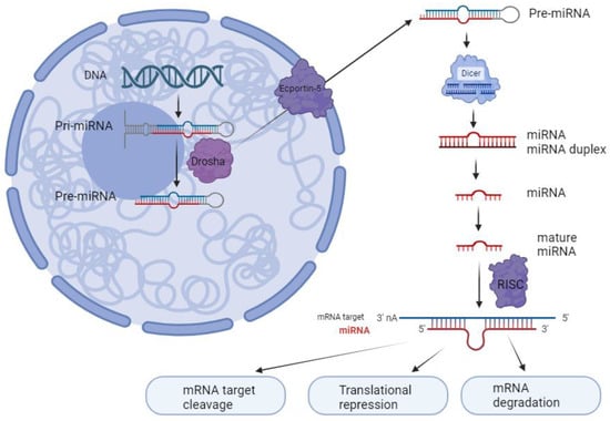 miRNA biosynthesis process. miRNA is generated by RNA polymerase II as pri-miRNA. These pri-miRNAs are then cleaved into pre-miRNAs by a complex of microprocessors that includes DROSHA. Subsequently, pre-miRNAs are transported from the nucleus to the cytoplasm via exportin-5, where they undergo further processing by Dicer to form double-stranded miRNA. Once double-stranded, the miRNA binds to the argonaute protein within the RNA-induced silencing complex (RISC), where it becomes separated into its mature strand. This mature strand remains within the RISC and is responsible for binding to target mRNA molecules to regulate gene expression, while the other passenger strand is enzymatically hydrolyzed (created with BioRender.com, accessed on 5 January 2024).