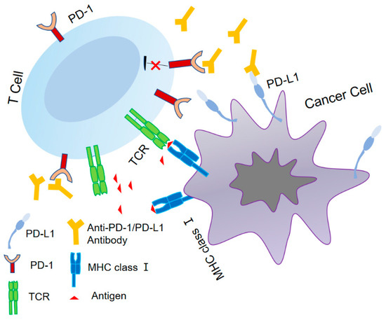 The goal of cancer immunotherapy is to use the patient’s immune system to thwart the tumor’s progression [1]. In the tumor microenvironment (TME), which is intimately linked to the immunological escape of tumor cells, tumor-infiltrating lymphocytes have a regulatory function on the immune system [2]. One of the most popular immunotherapies is immune checkpoint blocking, particularly with the use of anti-PD-1 monoclonal antibodies. By obstructing immune checkpoint pathways, cancer cells can evade the immune system. Compared with chemotherapy drugs, immunotherapy can provide advantages such as personalization and long-lasting benefits [3]. At present, discovered immune checkpoint signaling molecules include programmed cell death protein-1 (PD-1), programmed death ligand-1 (PD-L1), cytotoxic T lymphocyte-associated antigen-4 (CTLA-4), etc. [4]. The PD-1/PD-L1 pathway is one of the immune checkpoints that is most crucial to the management of malignant tumors [5]. More than 1000 antibodies targeting the PD-1/PD-L1 pathway have been evaluated in clinical trials and are approved for use in a variety of malignancies, such as melanoma [6], non-small cell lung cancer [7], renal cell carcinoma, etc. [8]. Finding therapeutic approaches to increase the effectiveness of blocking immune checkpoints is critically needed. Even while the majority of patients who use PD-1/PD-L1 blockers see a significant improvement in their prognosis, long-lasting therapy benefits are also hard to obtain [9,10].