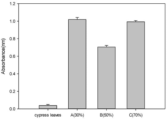 Measurement results of trans-2-nonenal removal activities of Psidium guajava leaf extracts and positive control (Cypress leaf extract) based on absorbance values: (A) 30% ethanol extract, (B) 50% ethanol extract, (C) 70% ethanol extract (p < 0.05).