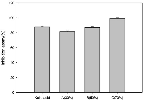 The results of analyzing the tyrosinase inhibition activities of concentrated P. guajava leaf extracts are shown in Figure 4. Kojic acid, the control group, showed an inhibition assay result of 87.9 ± 0.72%. Extract A showed an inhibition assay result of 81.5 ± 1.03%. Extract B showed an inhibition assay result of 87.2 ± 0.98%, and extract C showed a tyrosinase inhibition assay result of 99.1 ± 0.97%. As the ethanol content used for extraction increased, the tyrosinase inhibition assay increased. In particular, the 70% ethanol extract showed a higher whitening effect than the control group of Kojic acid. That is, extract A showed a whitening effect of about 92.7%, extract B about 99.2%, and extract C about 112.7% compared to the positive control group Kojic acid. This was thought to be due to the 1-octadecene molecule in the extract.