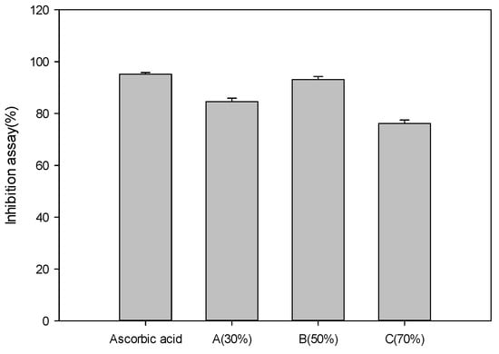 Tyrosinase inhibition activities of concentrated Psidium guajava leaf extracts: (A) 30% ethanol extract, (B) 50% ethanol extract, (C) 70% ethanol extract (p < 0.05).