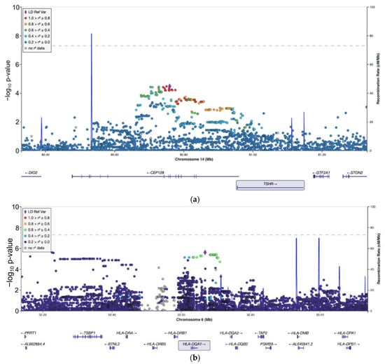 Regional association plots of (a) CEP128 and TSHR and (b) HLA-DQA1.
