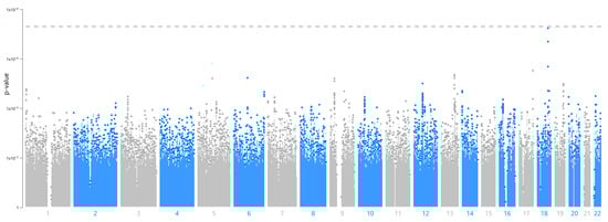 A GWAS for a serum selenium concentration > 80 µg/L identified the significant SNP rs6567243 on chromosome 18 in our study population. This SNP has a high minor allele frequency in the non-Finnish European reference population (Table 4). A Manhattan plot is shown in Figure 3, and a regional plot for this locus is shown in Figure 4.