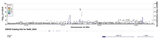 The SNP rs6567243 is found on chromosome 18 and encodes LINC01544/RNF152/PIGN. LINC01544 is a nonprotein coding RNA gene. RNF152 controls mammalian targets of rapamycin complex 1 (mTORC1) signalling, contributes to the reaction of cells to amino acid starvation [42], and facilitates the polyubiquitination of specific proteins, leading to their subsequent transportation to the proteasome for breakdown [43]. RNF152 is associated with breast, prostate, and colorectal cancer [44]. Data from observational studies analysing selenium exposure and cancer risk indicate a reduced risk of developing specific cancers at particular sites, including stomach, colorectal, lung, breast, bladder, and prostate cancers; however, further investigation is needed to evaluate whether selenium might alter the likelihood of cancer in individuals with specific genetic profiles or nutritional statuses [45].